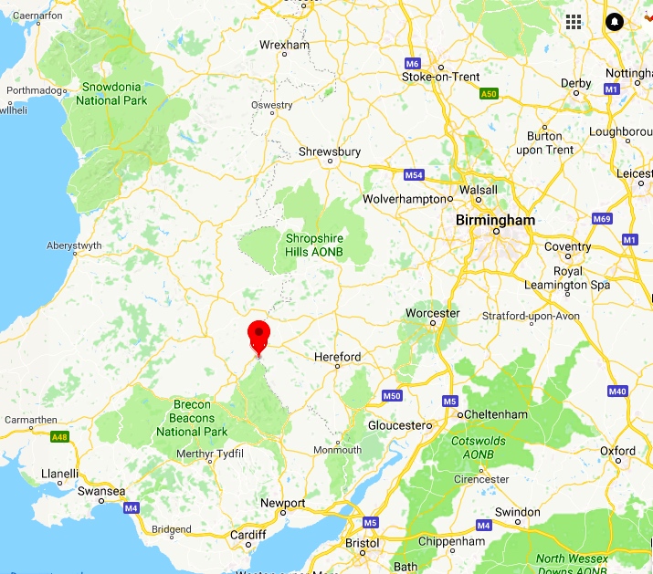 … The town lies on the south-east bank of the River Wye and is within the north-easternmost tip of the Brecon Beacons National Park, just north of the Black Mountains. The town is just on the Welsh side of the border with Herefordshire, England, here defined by the Dulas Brook. Where the brook joins the River Wye just north of the town, the border continues northwards along the river. The Wye was the boundary between the former counties and districts of Radnorshire and Brecknockshire.