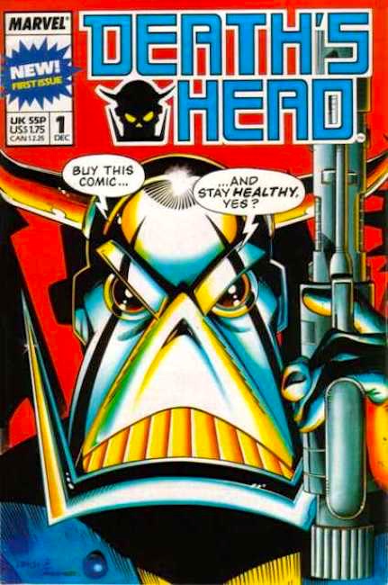 Death’s Head is a fictional character appearing in British comics and American comic books published by Marvel Comics. The character is depicted as a robotic bounty hunter (or rather, as he calls himself, a “freelance peace-keeping agent”). The character was created by writer Simon Furman and artist Geoff Senior for the company’s Marvel UK imprint. Furman decided to use Death’s Head in his Transformers stories, but believed that characters appearing in Transformers “were prone to be absorbed into that title’s catchall copyright” … Furman has stated that he chose the name Death’s Head for the character while unaware of the “Nazi-connotations of the name”.