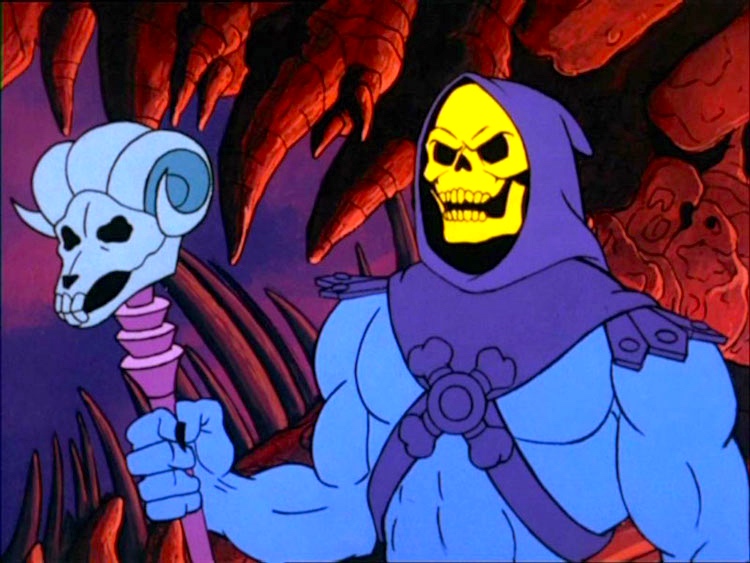 Skeletor is a fictional character and the primary antagonist of the Masters of the Universe franchise created by Mattel. He is the archenemy of He-Man. Depicted as a muscular blue humanoid with a purple hood over his yellow bare-bone skull, Skeletor seeks to conquer Castle Grayskull so he can obtain its ancient secrets, which would make him unstoppable and enable him to conquer and rule the fictional world of Eternia. However, the incompetence of his henchmen is always an impediment to achieving his ambitions.
