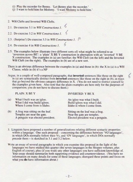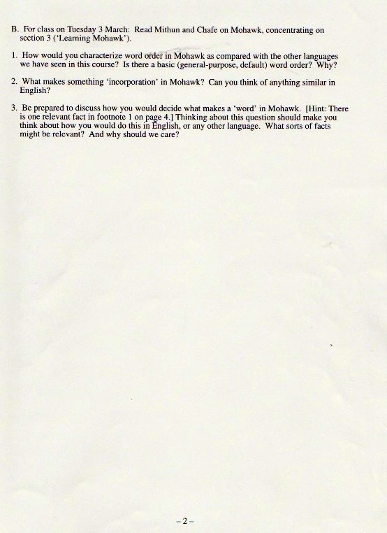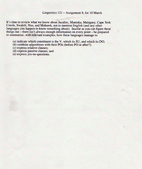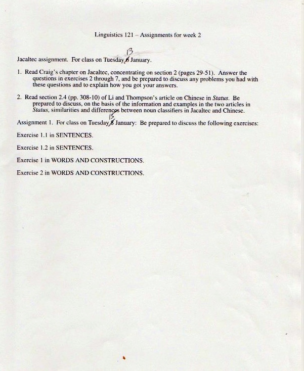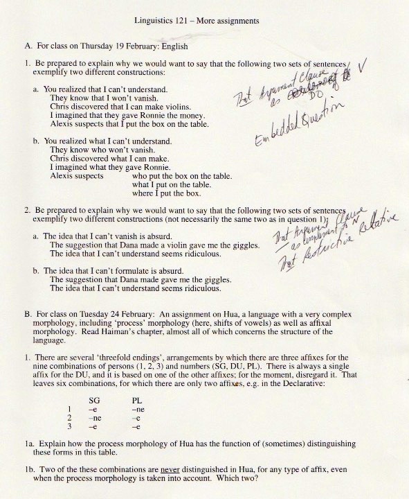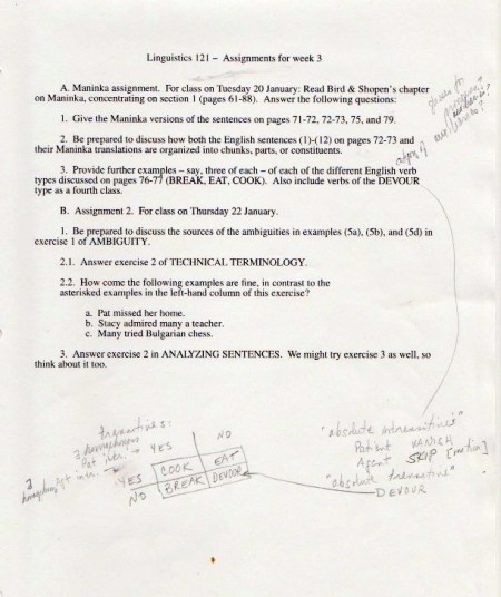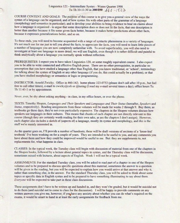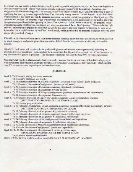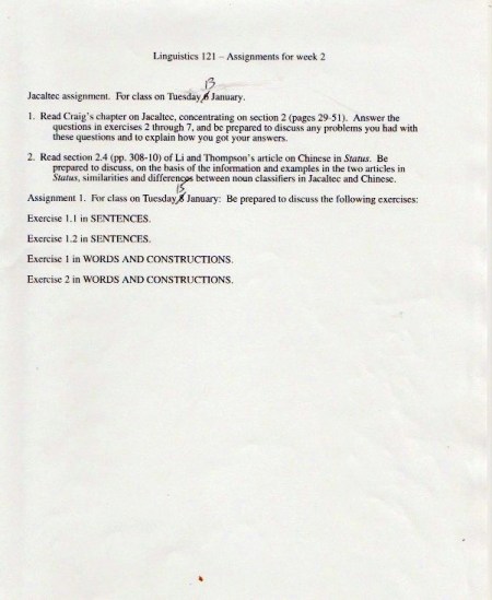 The original materials were composed with WordPerfect software, eventually transferred to Microsoft Word, but with all the formatting balled up in ways I haven’t been able to cope with. So I’m scanning in the 1998 version of the materials (with handwritten notes on many pages), starting with the set of assignments: syllabus, homework, and exams.