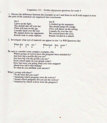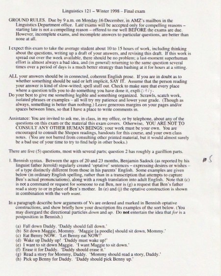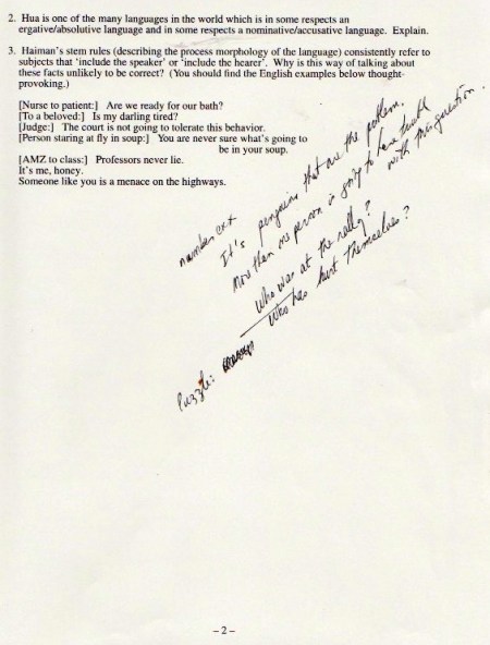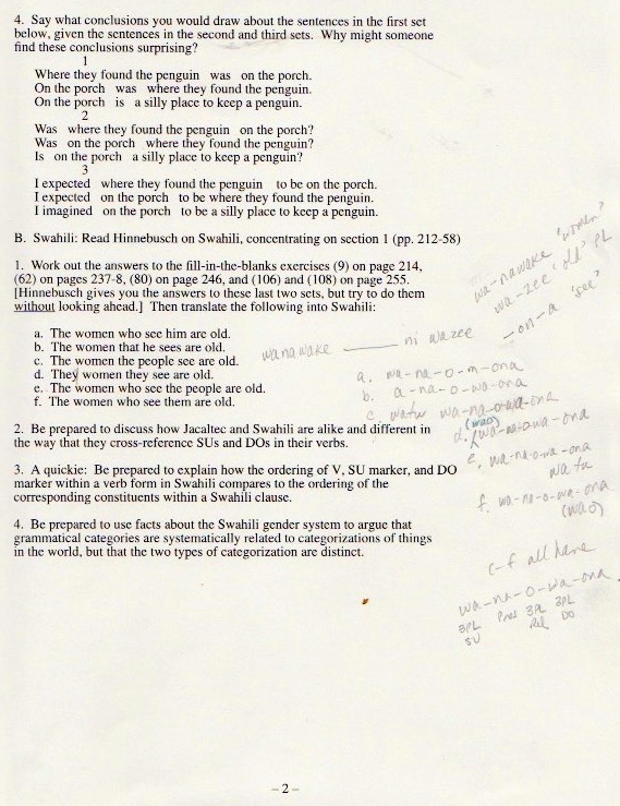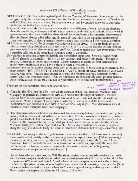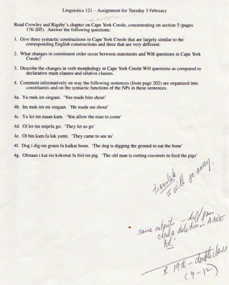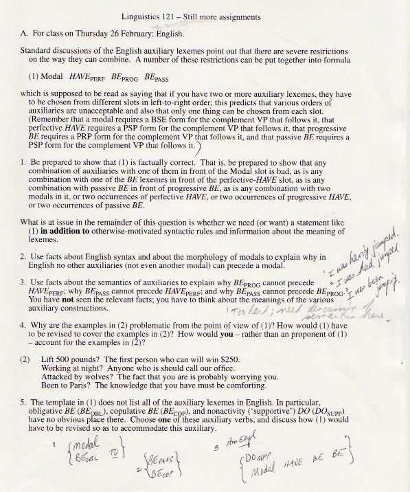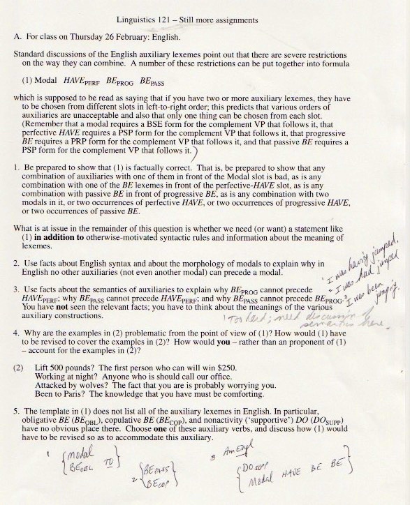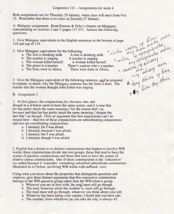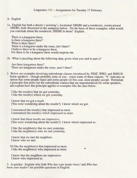 The original materials were composed with WordPerfect software, eventually transferred to Microsoft Word, but with all the formatting balled up in ways I haven’t been able to cope with. So I’m scanning in the 1998 version of the materials (with handwritten notes on many pages), starting with the set of assignments: syllabus, homework, and exams.