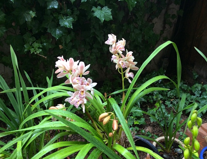 First, the recent cymbidium report. Last week’s new orchid blooms were these pretty pink ones: