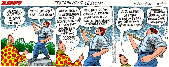 Alfred Jarry and Bill Griffith. This is not Griffith’s first Zippy homage to Jarry. From a 3/30/14 posting “Jarry at the diner”: