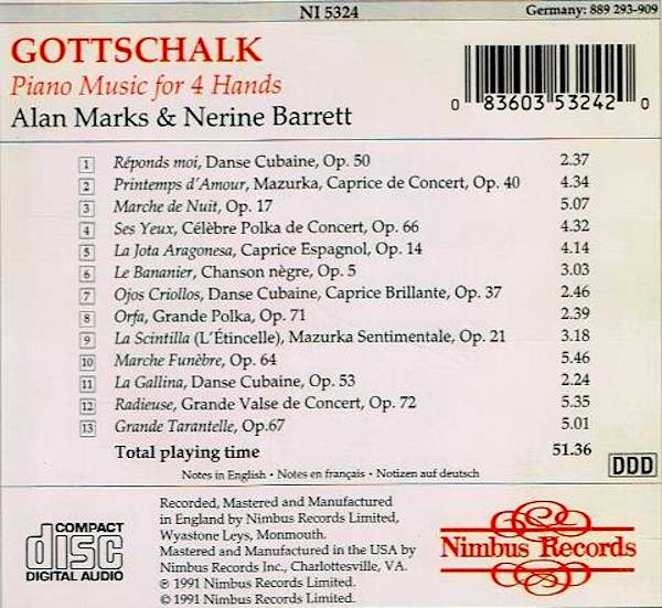 Without thinking about it consciously, I recognized the music as Gottschalk, and not just Gottschalk, but Gottschalk four-hand piano music. With that lodged in my unconscious, my memory took me to Vronsky & Babin (rather than Marks & Barrett, whose names I don’t think I’ve stashed in memory).