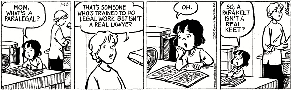 If paralegal is para + legal and the para- contributes a element of meaning roughly ‘sort of, but not real’, then parakeet must be para + keet ‘a sort of, but not real, keet’, whatever a keet is. (What of parasol and parapet?)