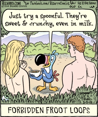 Formally, the POP combines forbidden fruit (as in the Garden of Eden story) with Froot Loops (the name of the extraordinarily sugary breakfast cereal) — a perfect portmanteau in pronunciation, though not quite in spelling. Visually, the cartoon shows the Garden of Eden setting, with Adam and Eve tempted not by the fruit of the tree of knowledge of good and evil, offered by a serpent, but by a bowl of Froot Loops, offered by the cereal’s toucan mascot — so it conceptually combines forbidden fruit with Froot Loops.