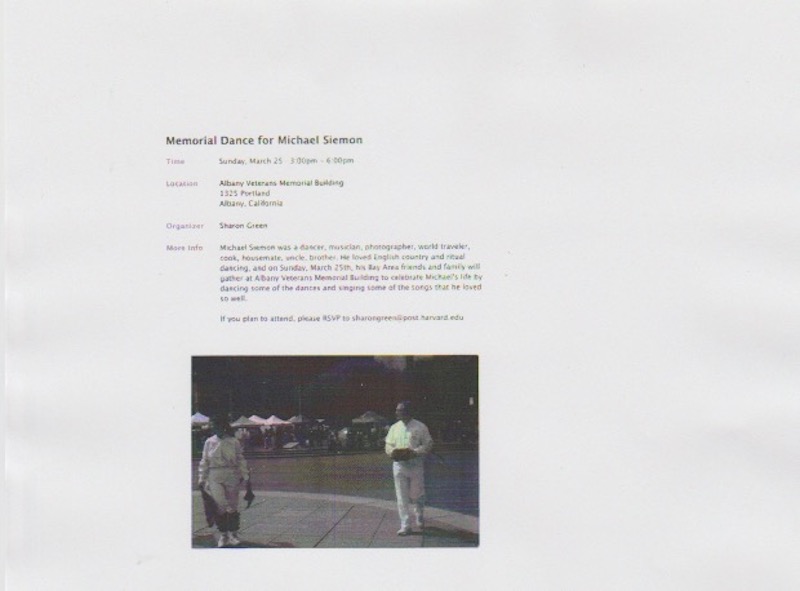 My friend Michael Siemon died back on November 1st in Oakland CA, and now his California family have planned a memorial dance in his honor, on the afternoon of Sunday March 25th. The flyer: