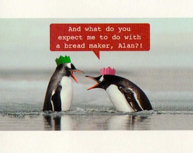 The pink crown identfies the speaking penguin as female, and she addresses the other penguin as Alan, so that one’s male. And she’s performing an aggrieved female partner routine — aggrieved that her man has given her, as a present, something to aid her in performing household duties, “w0men’s work”. In this case, a bread maker.