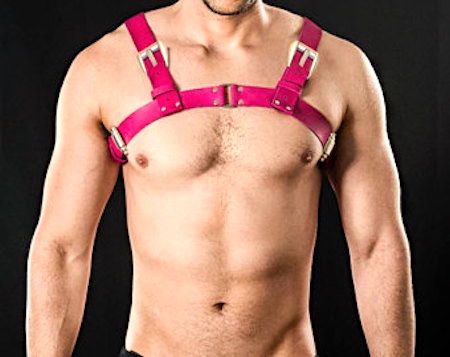 Pink leather harness, and his
