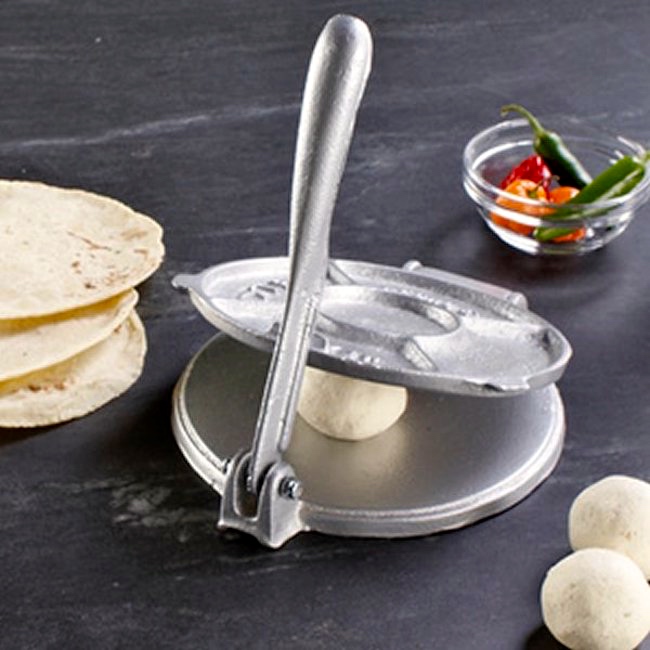 Then we did not lovingly pat balls of dough into flat tortillas, but instead used the shortcut of a tortilla press: put the ball on the bottom plate of a tortilla press, and press the top plate down to flatten the dough. A Tor-Mex cast-iron tortilla press of the very sort we used on Beaumont Rd.: