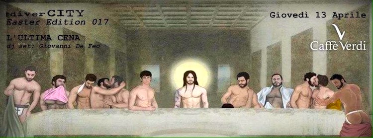 The picture used by DiverCity, an LGBT organisation in Salerno, in south Italy, features Jesus and his 12 disciples in various forms of undress, kissing and even engaged in oral sex.