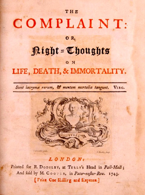 The Complaint: or, Night-Thoughts on Life, Death, & Immortality, better known simply as Night-Thoughts, is a long poem by Edward Young published in nine parts (or “nights”) between 1742 and 1745.