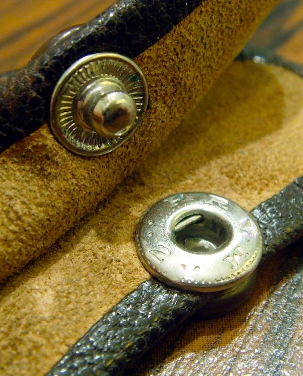 (#3) The two halves of a riveted leather snap fastener. The male half (top) has a groove which “snaps” in place when “pressed” into the female half (bottom)