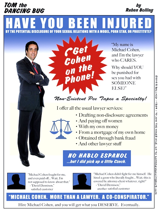 Multiple tips of the hat to Larry Horn, who wrote to David Denison (with a copy to me) on March 26th, with the hot news about David Dennison. And followed that up yesterday with a wonderful Tom the Dancing Bug cartoon on BoingBoing on the 17th (and the Dopelgänger label).