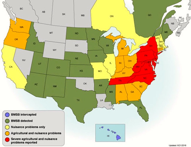 … The species is not native to this country, but in the years since it arrived it has spread to forty-three of the forty-eight continental United States, and — in patchwork, unpredictable, time-staggered ways — has overrun homes, gardens, and farms in one location after another. Four years before [Pam] Stone’s encounter [outside Landrum SC], a wildlife biologist in Maryland decided to count all the brown marmorated stinkbugs he killed in his own home; he stopped the experiment after six months and twenty-six thousand two hundred and five stinkbugs. Around the same time, entomologists documented thirty thousand stinkbugs living in a shed in Virginia no bigger than an outhouse, and four thousand in a container the size of a breadbox. In West Virginia, bank employees arrived at work one day to find an exterior wall of the building covered in an estimated million stinkbugs.