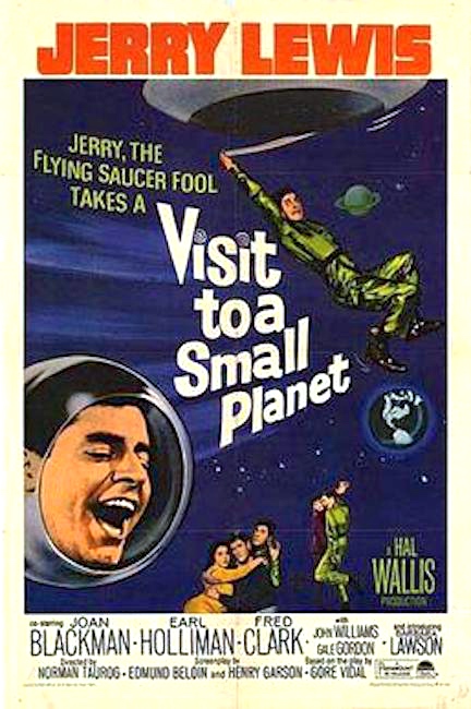 Visit to a Small Planet is a 1960 American black-and-white science fiction comedy film from Paramount Pictures, produced by Hal B. Wallis, directed by Norman Taurog, that stars Jerry Lewis and co-stars Joan Blackman, Earl Holliman, and Fred Clark [and, in smaller parts, Gale Gordon, Barbara Bostock, and Buddy Rich]