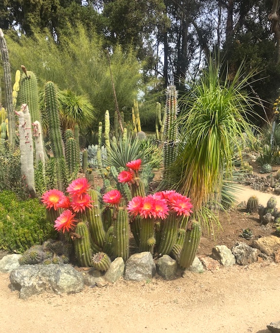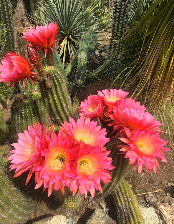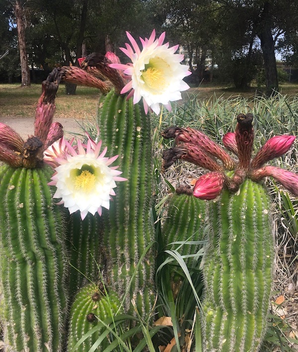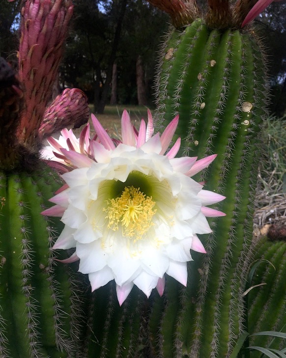In full bloom, they look like alien flowers the crew of the Enterprise might find when they beam down to some distant planet. From the cactus garden yesterday (all photos by Juan Gomez), a mid-long shot of a white ceroid cactus (with pink sepals):