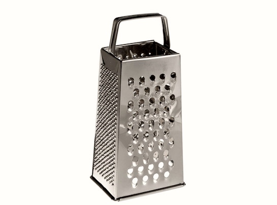 A wonderful piece of design: elegantly simple, useful, surprisingy sturdy (for a plastic tool), safe (no more skinned knuckles or fingertips), ambidextrous, adjustable (the high-end model comes with cylinders in three different grating sizes), and, in the plastic version, cheery.