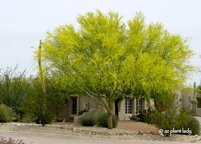 Parkinsonia florida, the blue palo verde (syn. Cercidium floridum), is a species of palo verde [in the legume / pea / bean family] native to the Sonoran Deserts in the Southwestern United States and Northwestern Mexico. Its name means “green pole or stick” in Spanish, referring to the green trunk and branches, that perform photosynthesis.