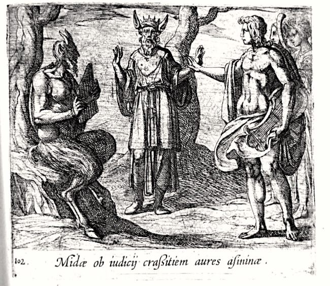 (#10) Left to right in an engraving: Pan, Midas, Apollo. Midas Judges Pan better than Apollo and his ears are turned to asses’ ears