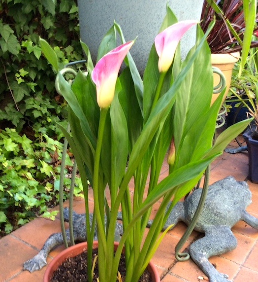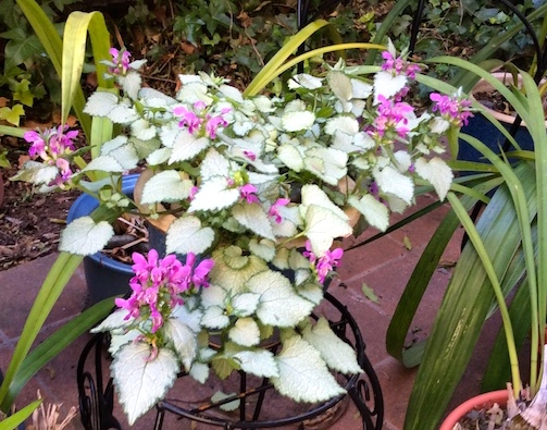 For Pride month, purple plants on my patio: the calla lily known locally as Cairo Callen (named for The Purple Rose of Cairo and singer/activist Michael Callen); and a silver lamium (now named the Silver Fox) in bloom: