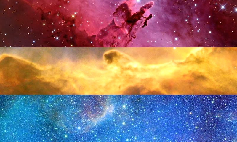 More Pride flags, all transformed versions of existing X Pride flags, for various values of X having to do with gender or sexuality. Transformed by Laurie Raye by superimposing images of the starry sky on them. So the now-standard six-stripe Pride flag becomes: