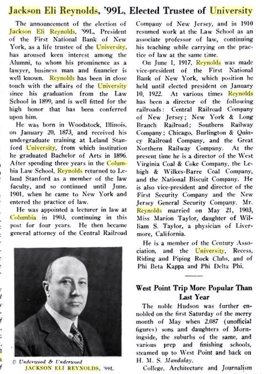 Still more seriously, Jackson Eli Reynolds, the person honored by the naming of the professorship that Dan now holds (or is about to hold). Most often, this is the person who fronted the money, who supplied the endowment that now provides the holder’s salary (though sometimes endowments are set up to honor someone in the donor’s family, or someone the donor admires, even, occasionally, a beloved former professor). I suspect that Reynolds was in fact the donor of the endowment that bears his name: lawyer, banker, and financier Jackson Eli Reynolds (1873-1958), Stanford A.B. 1896, Columbia Law 1899, and subject of a 1949 Columbia Univ. oral history Reminiscences of Jackson E. Reynolds.