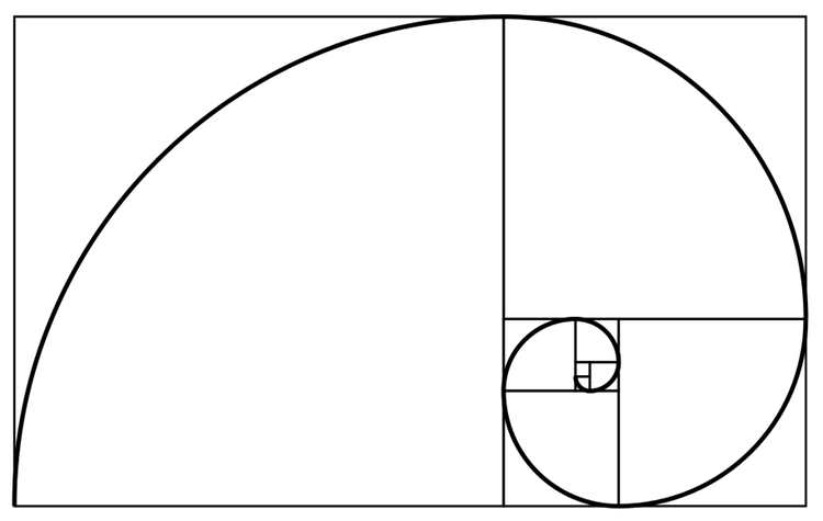 (#2) A Fibonacci spiral which approximates the golden spiral, using Fibonacci sequence square sizes up to 34. The spiral is drawn starting from the inner 1×1 square and continues outwards to successively larger squares.