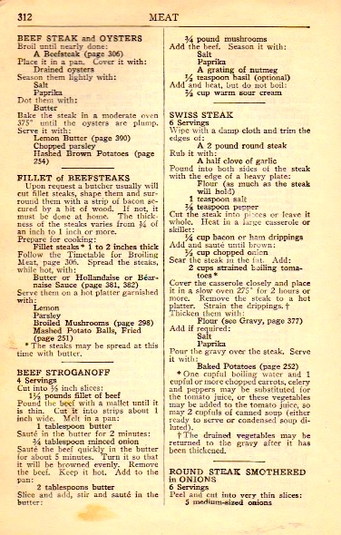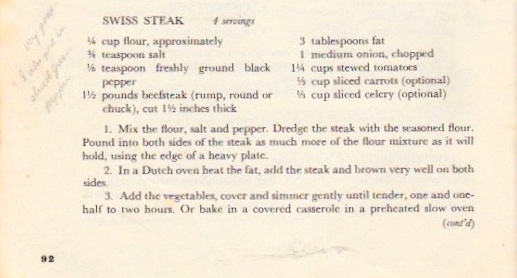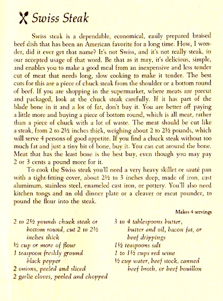 (#6) An unusual Swiss steak recipe, in that it lacks tomatoes and all other vegetables except chopped onions; Beard suggests serving it with plain boiled potatoes or boiled buttered noodes