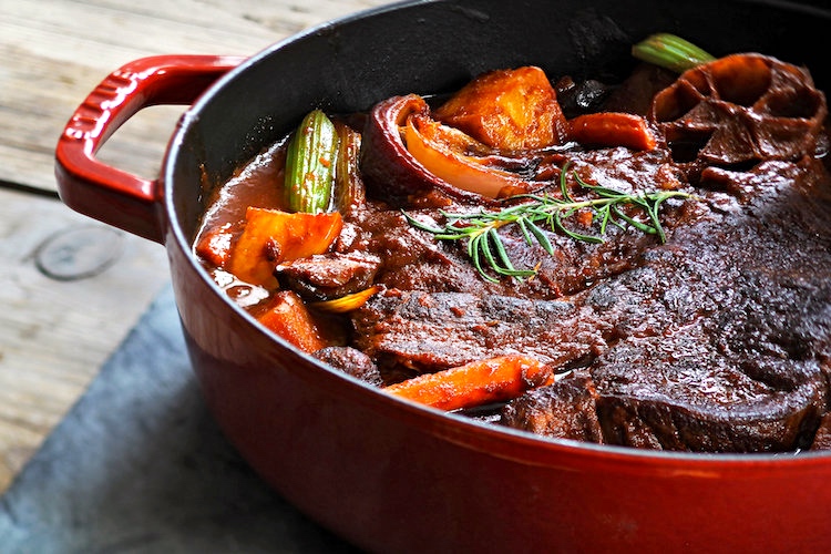 The browned beef is then braised in a liquid composed primarily of red wine with garlic and root vegetables (usually celery [or celeriac], carrots and onions) and herbs such as thyme, bay, or celery seed. Many recipes add tomatoes or canned tomato sauce, while others add beef broth and/or brandy or other distilled spirits. In some older recipes the addition of a calf’s foot or soup bones would add gelatin to the braising liquid, which serves to thicken the resulting sauce.