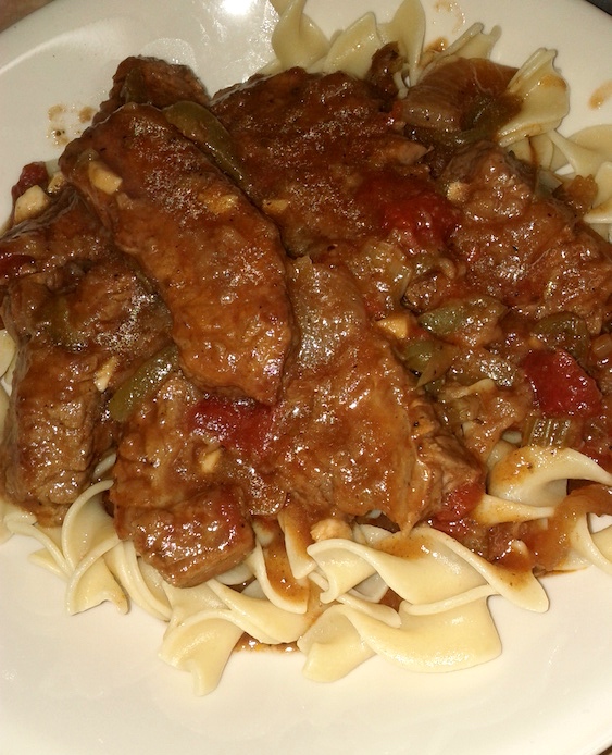 The dish. Swiss steak on noodles, a standard combination in the household of my childhood: