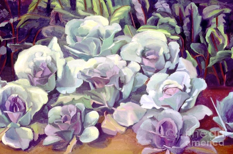 A painting of Swiss chard used as a garden ornamental: Natasha Hersh, Cabbage And Swiss Chard (link):