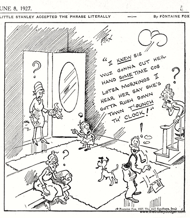 (#1) The 6/8/1927 strip, with lotsa eye dialect and a pun on punch the clock
