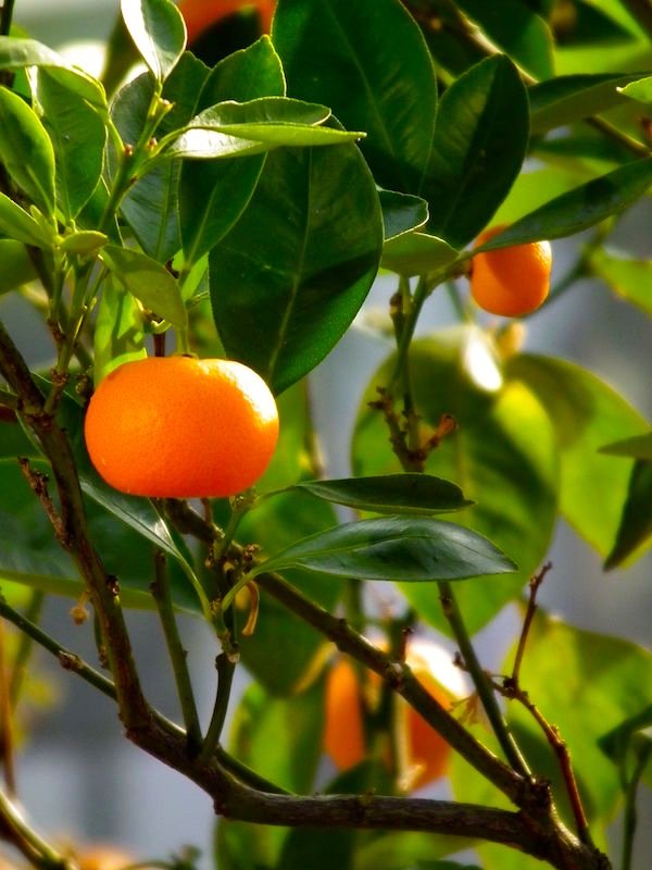 Mandarin oranges. My 4/28/13 posting “Orange and apple” has a note on Mandarin oranges (Citrus reticulata). Fruit on the tree: