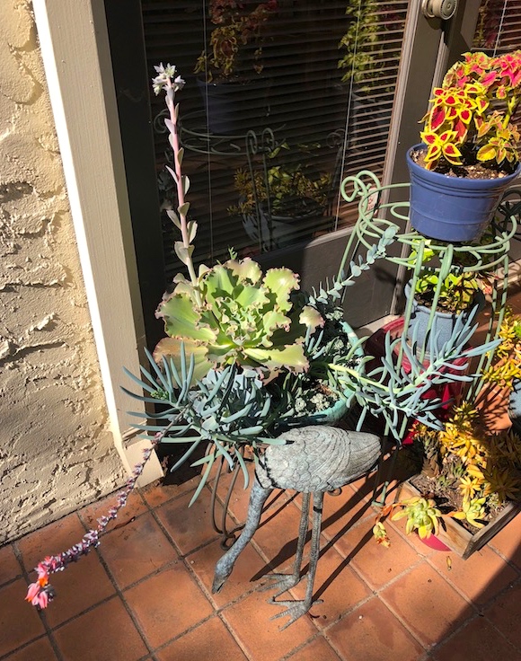 The Blue Curls rosette is much bigger, and its now-huge flower stalk is about to burst into rosy-pink bloom. The other Echeveria is almost at the end of its flowering. Meanwhile, the two Senecio plants — the silver-gray fingers — are both in bud, and the tall single-stemmed Crassula will soon follow suit.