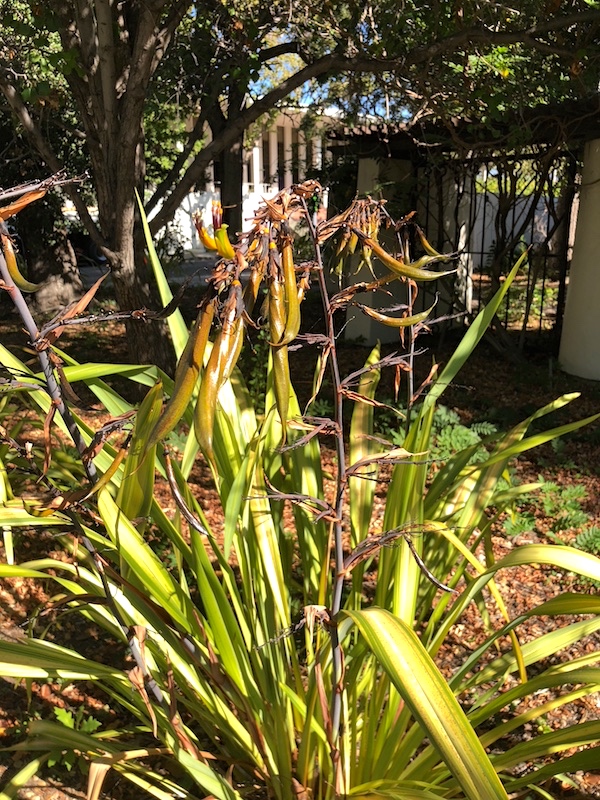 Continuing my project of reporting on plants that are very widely grown in my neighborhood — recently, from 8/16, “Lantana on the trail”, on trailing lantana; from 9/14, “Neighborhood flora: the cranesbills”; and from 9/15, “Neighborhood flora: Chinese elms” — I turn today to a striking foliage plant growing all over the place around me, especially widely on city ground, but also in private gardens. Big straplike leaves, striped in several colors (mostly green, yellow, and white), with tall flower stalks (looking much like the giant alien-planet flower stems of agave plants), currently bearing long seed pods that are green when fresh but then turn to black as they ripen. Of the genus Phormium, highly recommended by the City of Palo Alto for filling space in xeriscapes.