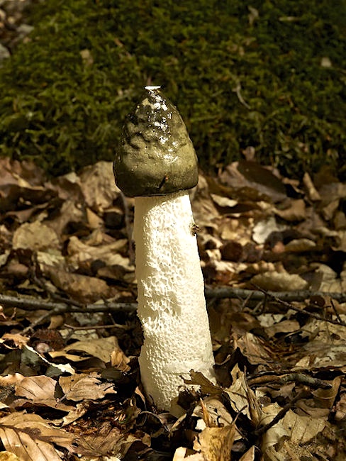 Phallus impudicus, known colloquially as the common stinkhorn, is a widespread fungus recognizable for its foul odor and its phallic shape when mature, the latter feature giving rise to several names in 17th-century England [prick mushroom, for example]. It is a common mushroom in Europe and North America, where it occurs in habitats rich in wood debris such as forests and mulched gardens. It appears from summer to late autumn. The fruiting structure is tall and white with a slimy, dark olive colored conical head. Known as the gleba, this material contains the spores, and is transported by insects which are attracted by the odor — described as resembling carrion. Despite its foul smell, it is not poisonous and immature mushrooms are consumed in parts of France and Germany.