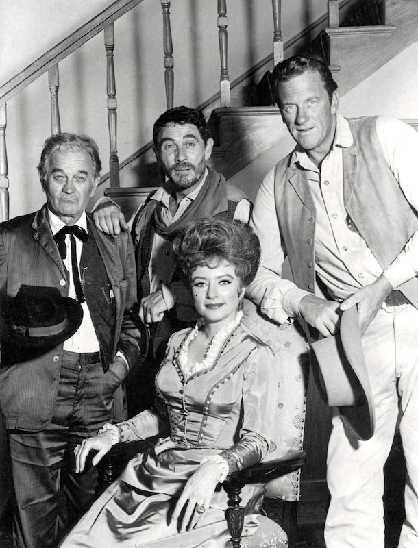 (#1) Clockwise from top: Ken Curtis (Festus, Matt’s deputy), James Arness (Matt), Amanda Blake (Kitty, the town’s saloonkeeper), and Milburn Stone (Doc, the town’s doctor) in 1968