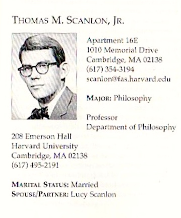 Born June 28, 1940, Scanlon grew up in Indianapolis, Indiana; obtained his undergraduate degree from Princeton University in 1962 [in philosophy, as a student of Paul Benacerraf, who was also my adviser]; earned his PhD in philosophy from Harvard under Burton Dreben [at the time Tim and Lucy were in Cambridge for Tim’s graduate work, Ann Daingerfield Zwicky and I were there for my graduate work at MIT, so we got to spend pleasant time together]; studied for a year at Oxford University on a Fulbright Scholarship; and returned to Princeton University, where he taught from 1966 until 1984. He was made a MacArthur Fellow in 1993.