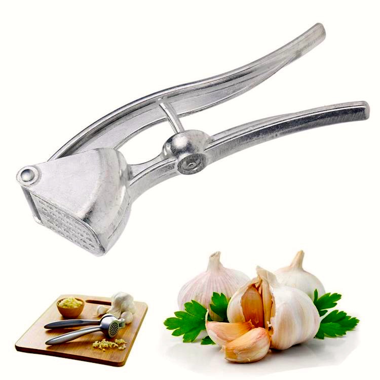 A garlic press (also known as a garlic crusher in Australia, New Zealand and the United Kingdom), is a kitchen utensil [usually made of aluminum or stainless steel] to crush garlic cloves efficiently by forcing them through a grid of small holes, usually with some type of piston. Many garlic presses also have a device with a matching grid of blunt pins to clean out the holes.