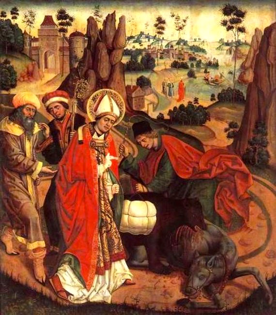 (#1) 15th century: Saint Corbinian depicted in The Miracle of the Bear (1489) by Jan Polack. Diocesan Museum in Freising, Germany.
