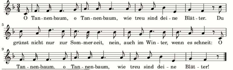 Meanwhile, there’s the song “O Christmas Tree” (German original “O Tannenbaum”, at first with no holiday connections but now treated as a Christmas carol). The first verse in German:
