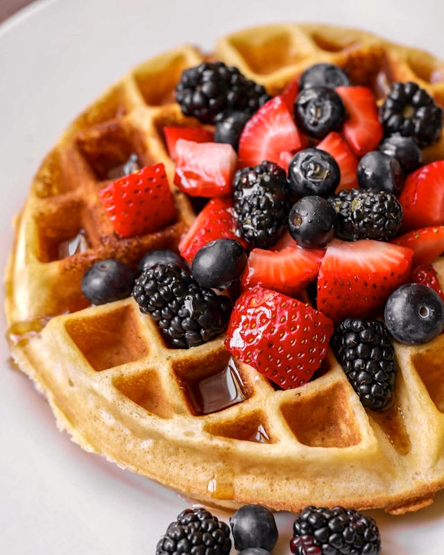 In North America, Belgian waffles are a variety of waffle with a lighter batter, larger squares, and deeper pockets than ordinary American waffles. Belgian waffles were originally leavened with yeast, but baking powder is now often used. They are often eaten as a breakfast food; toppings vary from whipped cream, confectioners sugar, soft fruit, and chocolate spread, to syrup and butter or margarine. They may also be served with vanilla ice cream and fresh fruit (such as strawberries) as a dessert.