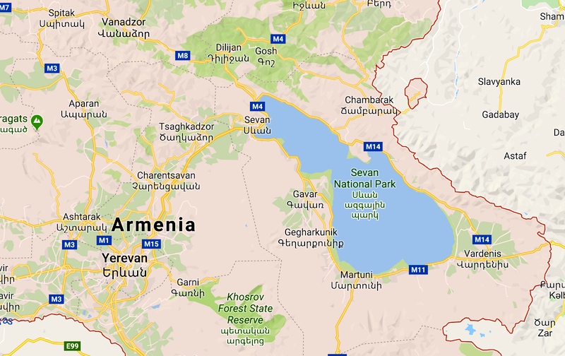 (#1) Swissly picturesque spots: the towns of Sevan and Dilijan. On the right (east), Azerbaijan. In the bottom left: a corner of Turkey. Not shown on this map, but not far away: to the north, Georgia; and to the south, the enclave of the Nakhchivan Autonomous Republic of Azerbaijan, and Iran.