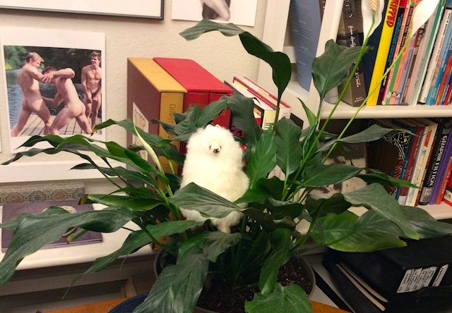 A souvenir from Juan Gomez, who visited Peru (Cuzco, Machu Picchu) with his family for the New Year’s holiday: a little stuffed llama I’ve named Glama Grrl (he’s seen here perched high in the spathyphyllum forest on my worktable):