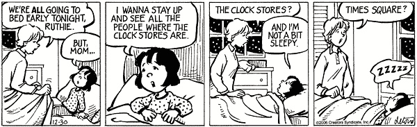 Ruthie has heard that huge numbers of people gather in Times Square on New Year’s Eve. But why is it called Times Square? Obviously ’cause that’s where you go to tell time — where the clock stores are.