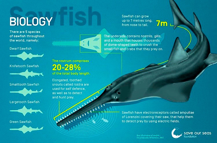 (#3) Sawfish biology (link)Sawfishes, also known as carpenter sharks, are a family of rays characterized by a long, narrow, flattened rostrum, or nose extension, lined with sharp transverse teeth, arranged in a way that resembles a saw. They are among the largest fish with some species reaching lengths of about 7–7.6 m (23–25 ft). They are found worldwide in tropical and subtropical regions in coastal marine and brackish estuarine waters, as well as freshwater rivers and lakes.