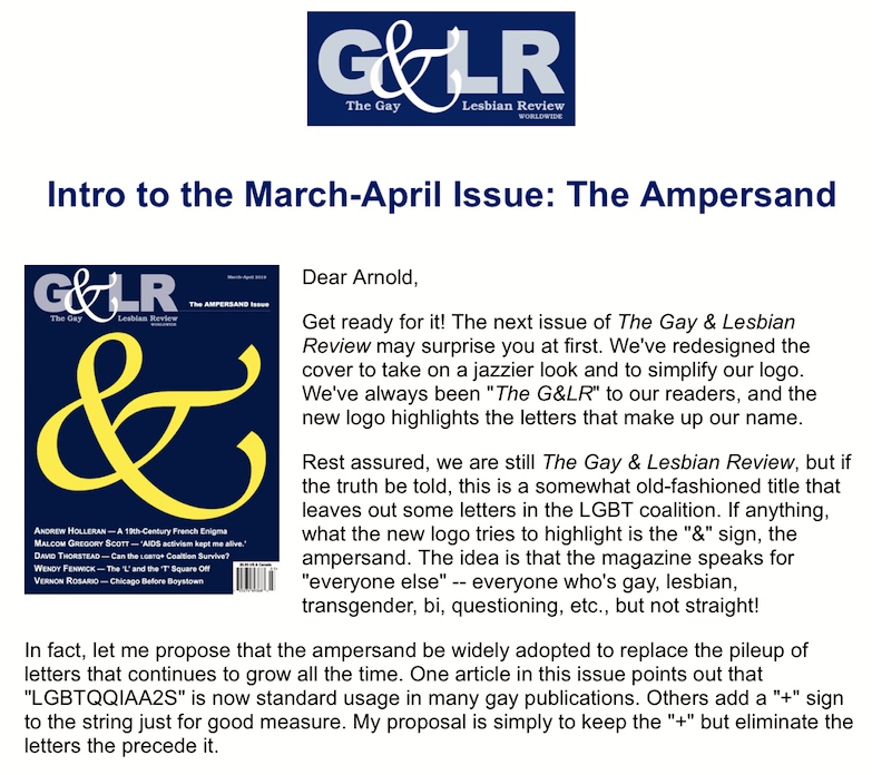 A mailing today about the March-April 2019 issue of G&LR (The Gay & Lesbian Review):