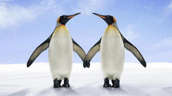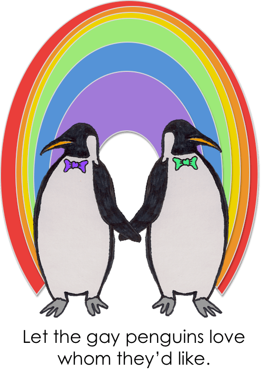 — Gay penguins. Since I’m a gay man with a penguin totem, obviously of great interest to me. Trainor’s drawing looks like a version of this image: