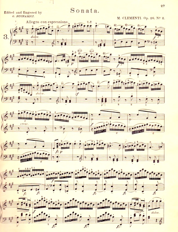 (#7) The first page of Clementi’s Sonata in F♯ minor, in the edition I began studying in January 1957; the piece is clearly labeled as Op. 26 No. 2 in this edition, but it’s now uniformly listed as Op. 25 No. 5